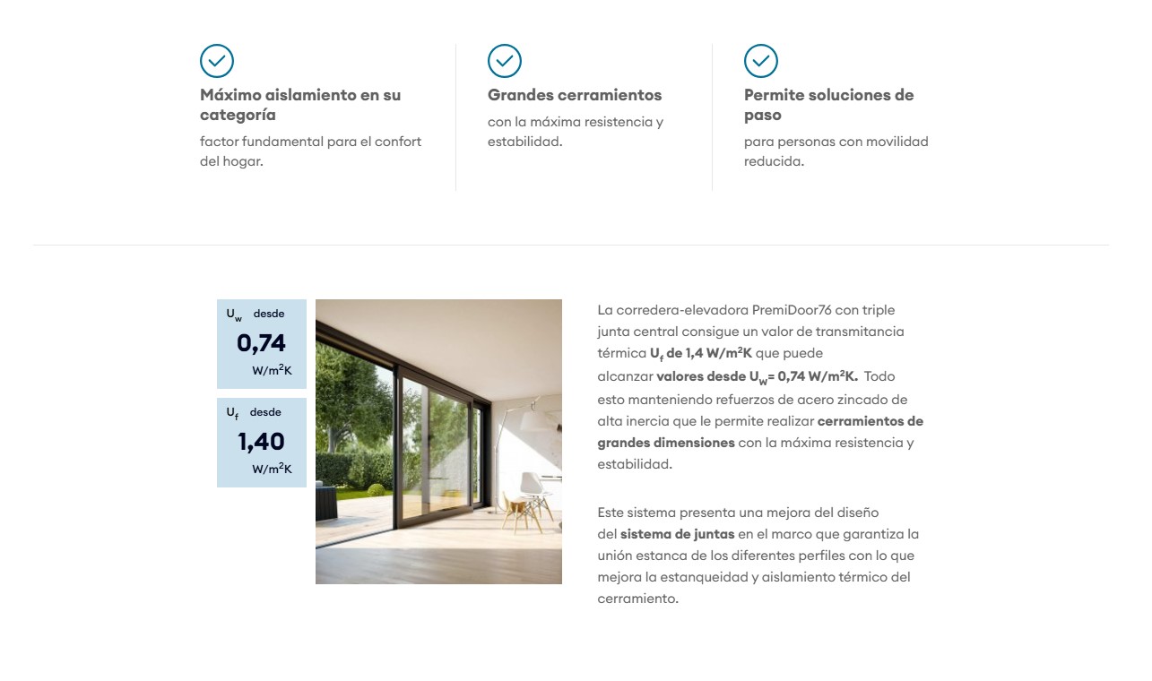 - La corredera-elevadora PremiDoor76 con triple junta central consigue un valor de transmitancia manteniendo refuerzos de acero zincado de alta inercia que le permite realizar cerramientos de grandes dimensiones con la máxima resistencia y estabilidad.